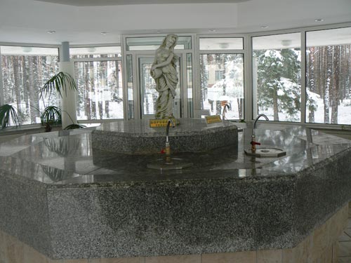 В лечебном корпусе: огромный бассейн с минеральной водой, аквамассажи,