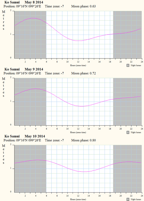 Добрый день! А мы отдыхали на Самуи с 28 апреля по 13 мая и в центре Ламая у нас никаких отливов не наблюдалось. Было всегда примерно одинаково глубоко. Хотя люди, отдыхавшие севернее жаловались, что воды у них по колено. Наверное, этот график распространяется только на мелководные пляжи.Я тоже переживала, что будет мелко, но отдохнули отлично. В любом случае спасибо за информацию, которую Вы предоставляете путешественникам!!! Удачи и хорошей погоды!!!