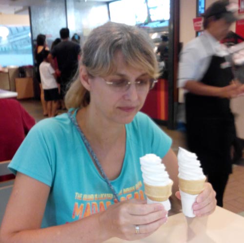 Жареный цыплёнок из Кентукки - KFC пришел в Таиланд в 1984 году и сейчас насчитывает более 400 филиалов по всей стране. Как ни странно, тайцы полюбили этот ресторан быстрого питания и в основном молодежь с удовольствием хрустит острой курочкой. Нам такая еда не нравится, но мороженное в KFC (Паттайя) вкусное, правда на Самуи вкуснее мороженное в Макдоналдсе. Цена в разных KFC отличается, почему мне не понятно. Самое вкусное и дешевое мороженное KFC в Лотосе на Сукхумвите (10 бат), вода со льдом бесплатная стоит на столике с соусами. Кроме мороженого мы берем холодные напитки кофейные и шоколадные, но большого восторга я от них не испытываю. Вся другая еда KFC отзыва в наших сердцах не нашла. Я предпочитаю "нудл-суп" с макашницы всем этим хрустящим курочкам и бургерам.
